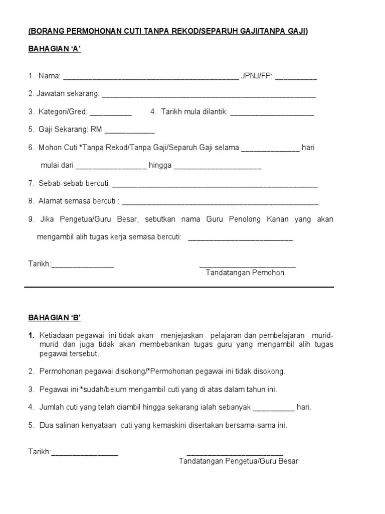 Oleh sebab itu, anda perlulah menulis surat memohon cuti kerja untuk mendapatkan kebenaran majikan. Contoh surat cuti tanpa jawatan kosong sektor kerajaan facebook. Memohon cuti saya seperti nama dan . Contoh surat rasmi memohon cuti kerja tanpa gaji liga mx r. Surat permohonan cuti tanpa gaji urusan peribadi kosong kerja. Recommend stories · borang cuti tanpa gaji · memohon cuti tanpa gaji 4upload · surat cuti tanpa gaji.doc · surat pengesahan ibu bapa tanpa penyata gaji · contoh .